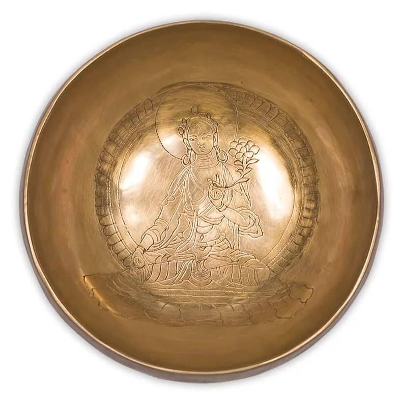 Este hermoso cuenco tibetano grabado se utiliza tradicionalmente en rituales de purificación, tanto para limpiar energías personales como para armonizar situaciones planetarias. Su energía se vincula con la Bodhisattva Tara Blanca, cuya imagen adorna el fondo del cuenco.