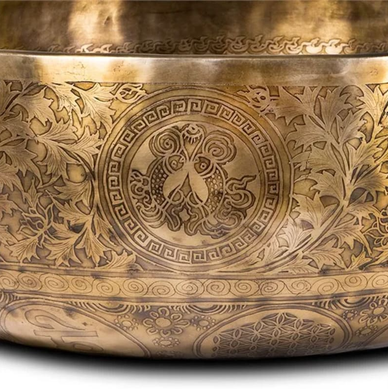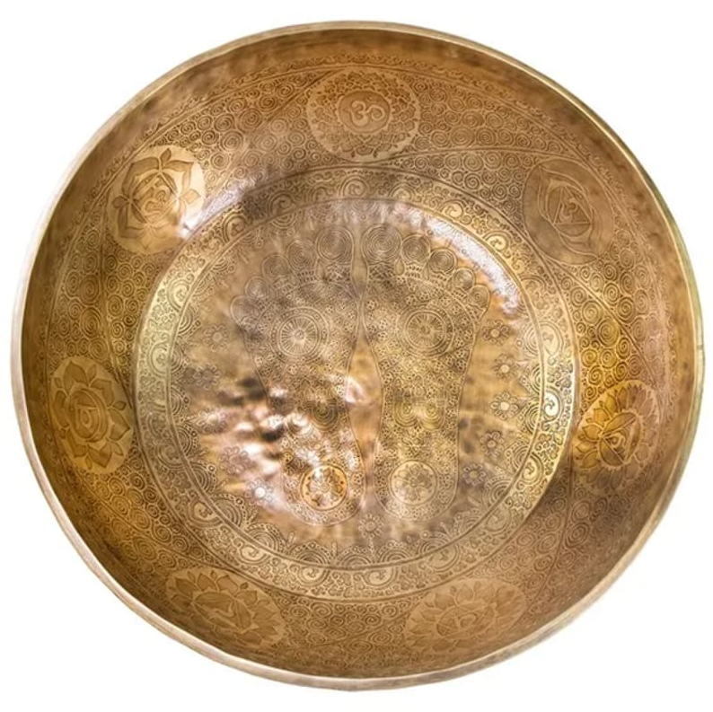Cuenco tibetano sonoro ornamentado dentro del cuenco por hermosa incisión de los pies del Buda y los siete símbolos de los chakras y en el exterior: símbolos de la Flor de la Vida, ocho símbolos auspiciosos y el mantra OM MANI PEME HUM.