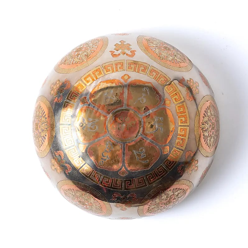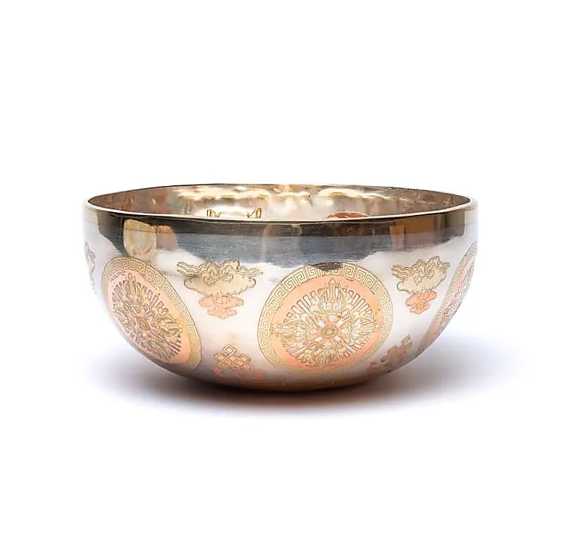 Cuenco tibetano sonoro ornamentado y plateado,decorado en su interior con las imágenes del Buda de la Medicina y los cinco Budas Dhyan , el cuenco está decorado con símbolos auspiciosos como el doble dorje, el loto y el nudo sin fin, así como el mantra de la compasión “Om Mani Pad Me Hum”