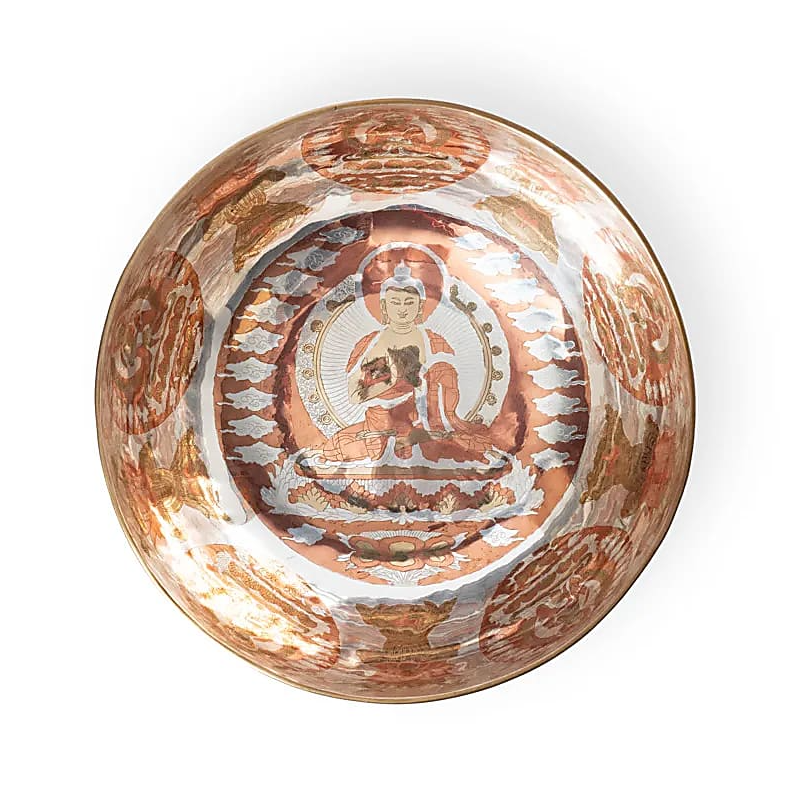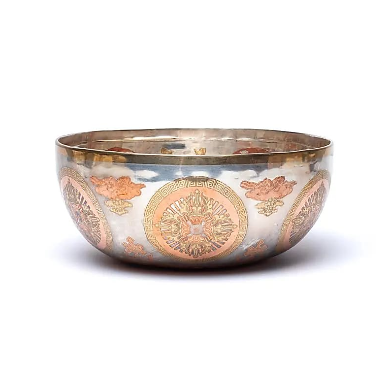 Cuenco tibetano sonoro ornamentado y plateado, decorado en su interior con imágenes de Buda Vairochana y los demás Budas Dhyani. El cuenco está decorado con símbolos auspiciosos como el doble dorje, el loto y el nudo sin fin, así como el mantra de la compasión “Om Mani Pad Me Hum”