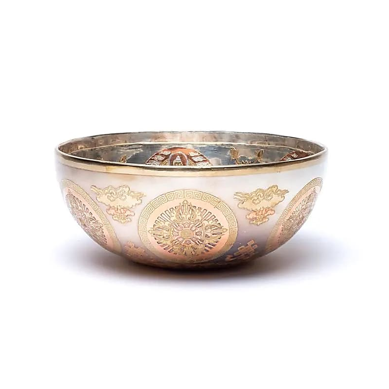 Cuenco tibetano sonoro ornamentado y plateado,decorado en su interior con las imágenes de Chenrezig, el Buda de la gran compasión, y los cinco Budas Dhyani , el cuenco está decorado con símbolos auspiciosos como el doble dorje, el loto y el nudo sin fin, así como el mantra de la compasión “Om Mani Pad Me Hum”