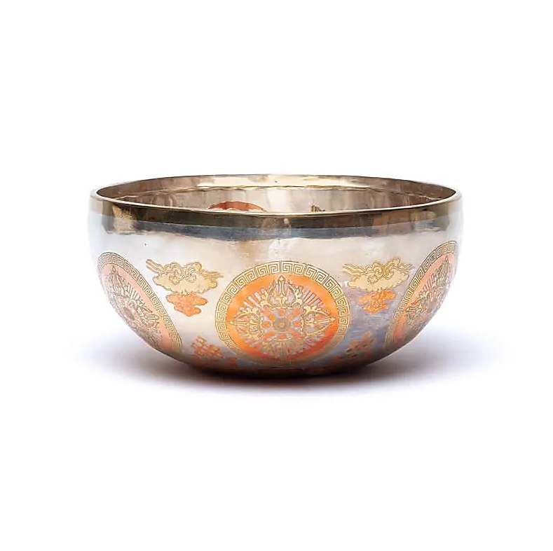 Cuenco tibetano sonoro ornamentado y plateado, decorado en su interior con las imágenes de Tara Verde, el Buda femenino de la compasión y la protección, y de los cinco Budas Dhyani. El cuenco está decorado con símbolos auspiciosos como el doble dorje, el loto y el nudo sin fin, así como el mantra de la compasión “Om Mani Pad Me Hum”