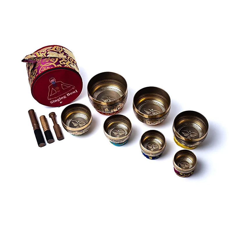 SET de 7 cuencos tibetanos decorativos, hechos de cobre, zinc, estaño y 8 metales preciosos (Ag, Ni, Cd, Ru, Pd, Pt, Cr, Mn), cada uno ricamente adornado y con lo que se conoce como los Ojos de Buda u “ojos de la sabiduría”